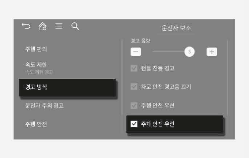 시동이 켜진 상태에서 인포테인먼트 시스템의 설정 → 차량 → 운전자 보조 → 경고 방식 → 주차 안전 우선을 선택하면, 안전한 주차를 위하여 서라운드 뷰 모니터 작동 중에는 오디오 음량을 줄여 줍니다.