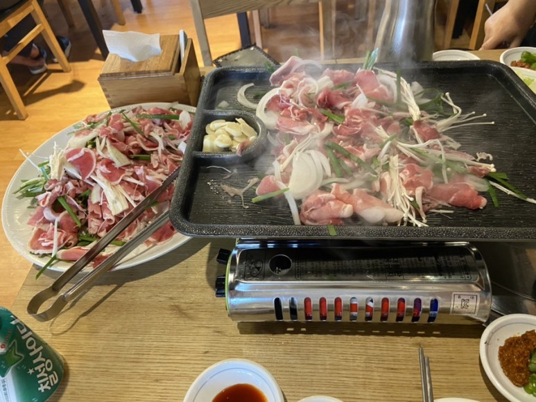 식사를 마치면 후식으로 잔치국수가 나오는데 맛이 굉장히 좋아요. 깜빡하고 고기만 드시고 가실 수도 있는데 고기를 다 드셨으면 잔치국수를 꼭 달라고 하셔서 드세요. 고기를 다 먹기 전에 볶음밥을 주문해서 고기와 볶아 먹으면 탄수화물로 마무리할 수 있어요. 우리나라는 식사의 마무리는 역시 볶음밥이에요.
