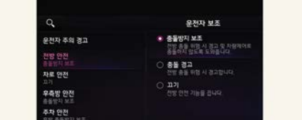 시동 ON 상태에서 인포테인먼트 시스템의 설정 → 운전자 보조 → 전방 안전을 차례로 선택하여 충돌방지 보조 / 충돌 경고 / 끄기 3가지 기능의 사용 여부를 설정할 수 있다.