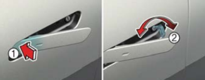 바깥쪽 도어 핸들(1) 앞부분을 누르면 뒷부분이 나온다. 도어 핸들 앞부분을 누른 상태에서 비상키(2)를 키 손잡이가 지면을 향하도록 키 홈에 꽂고 좌우로 돌려 운전석 도어를 잠그거나 잠금을 해제할 수 있다.
