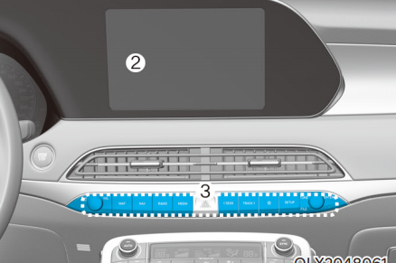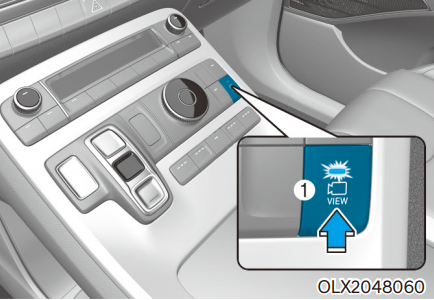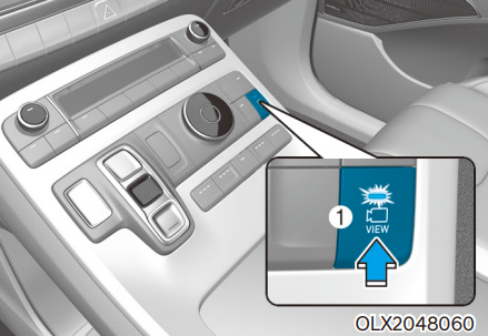 시동 ON 상태에서 서라운드 뷰 모니터 버튼 ①을 누르면 인포테인먼트 시스템이 화면이 표시된다. 버튼을 누르면 버튼 내의 표시등이 켜진다.