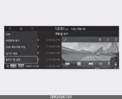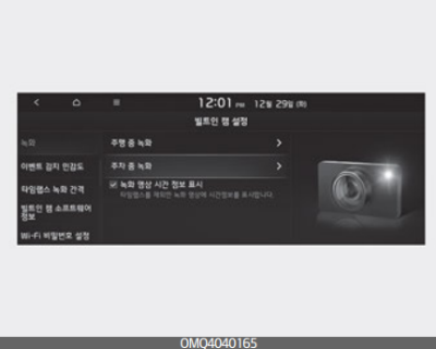 인포테인먼트 시스템 홈 화면에서 빌트인 캠을 선택한 후, 빌트인 캠 설정 → 녹화 → 주행 중 녹화 또는 주차 중 녹화를 차례로 선택한다. 주행 및 주차 시 녹화 방법을 선택할 수 있다.