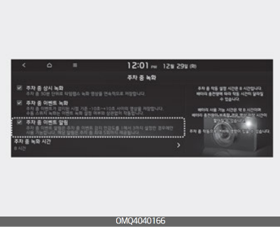 차량이 출고될 때 주행 및 주차 중 녹화 기능이 해제되어 있다. 기능 사용을 위해서는 반드시 설정을 통해 녹화 조건을 선택해야 한다.