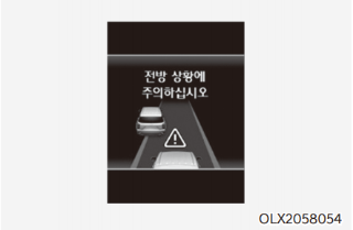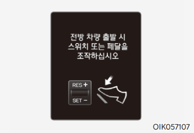 30km/h 이하에서 앞 차량과의 거리 제어 중, 앞 차량이 옆차선으로 사라지면 경고음이 울리면서 그림과 같은 표시가 나타난다. 이 경우 새롭게 나타난 정차 차량이나 물체가 있으면 충돌할 수 있으니 전방 도로 상황 및 주행 상태를 확인하고 필요하면 브레이크 페달을 밟아 직접 속도를 조절하는 것이 좋다.