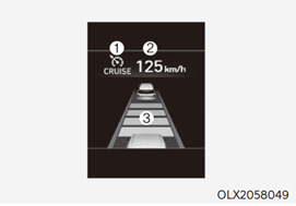 계기판 LCD 표시창에서 스마트 크루즈 컨트롤 작동 상태를 보기 위해서는 어시스트 모드 화면을 선택한다. ① : 크루즈 표시등, ② : 설정 속도, ③ : 차간거리 표시등이 표시된다.