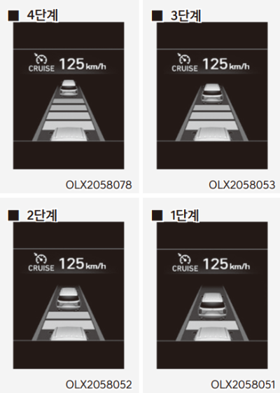 버튼을 누를 때마다 차간 거리가 변경되어 차량의 속도 및 도로 상태에 따라 선택할 수 있다.