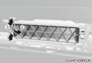 공조 장치용 에어 필터 커버의 왼쪽 ③을 누른 상태에서 잡아당겨 커버를 분리한다. ④