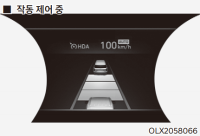 HDA 작동 조건을 만족하고 운전자의 설정속도와 고속도로 제한 속도가 일치하면 자동속도 설정 모드로 진입한다. (설정 속도 및 AUTO 심벌 초록색 표시, 알림음 발생)