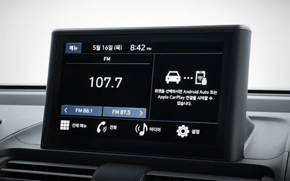 2026 캐스퍼 스마트 트림 인포테인먼트는 8인치 디스플레이 오디오가 기본 적용됩니다. 4개의 스피커가 적용되며 블루투스 핸즈프리 및 폰 프로젝션 기능을 사용할 수 있어 스마트폰의 지도 앱을 사용할 수 있습니다.