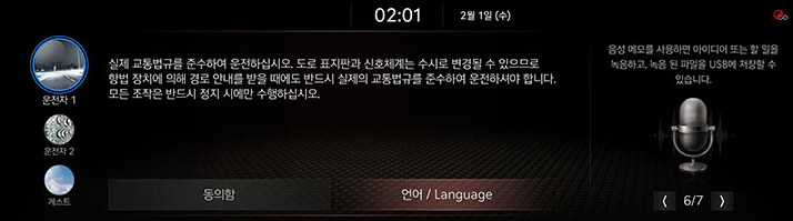 엔진 시동 버튼을 누르고 시동이 켜지면 시스템이 켜지면 부팅 절차가 시작되고 안전경고 페이지가 표시됩니다. 시스템의 언어를 변경하려면 '언어 / Language'를 누르면 됩니다. 시스템의 프로필을 변경하려면 왼쪽 편의 '운전자 1, 운전자 2, 게스트'를 선택하면 됩니다.