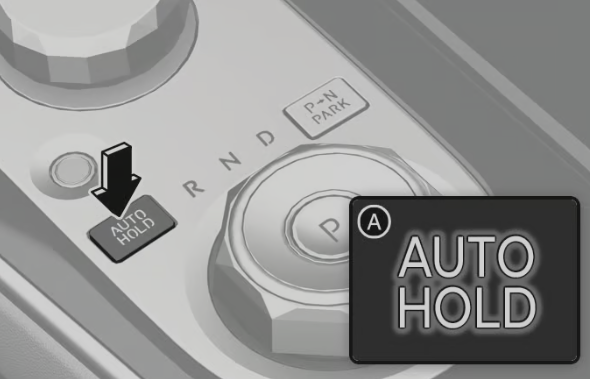 운전석가 브레이크 페달을 밟은 상태에서 AUTO HOLD 버튼을 누르면 자동 정차 기능이 작동 대기 상태가 되고 계기판에 흰색 AUTO HOLD 표시등이 켜집니다.