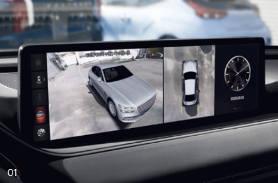 제네시스 G80 서라운드 뷰 모니터는 차량에 장착된 카메라를 이용하며, 차량 주변의 영상을 인포테인먼트 시스템을 통해 표시하여 안전하게 주차할 수 있도록 도와준다.