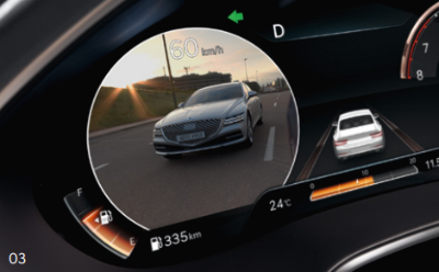 제네시스 G80 증강현실 내비게이션은 실제 주행 영상 위에 안내 지점과 진출 방향이 정확히 표시되어 직관적으로 운행정보를 파악할 수 있다. 목적지 표시, 스마트 크루즈 정보 표시, 전방 차량 출발 알림 등 첨단 운전자 보조 시스템과 관련한 정보까지 세심하게 표현해 준다.