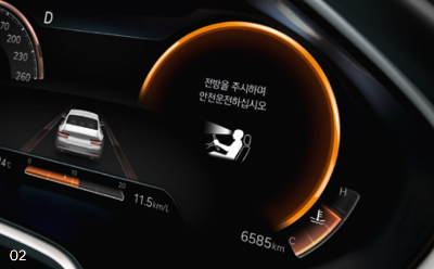 전방 주시 경고는 운전자가 전방을 주시하지 않는 상황으로 판단될 경우, 경고를 해주는 기능으로 계기판에 내장된 실내 카메라가 운전자의 얼굴 방향, 눈 감음 여부 등을 인식하여 주행 중 전방 주시 태만을 경고한다.