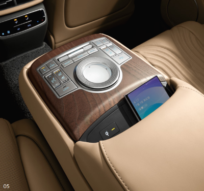 뒷좌석 다기능 암레스트 뒷좌석에 무선 충전 패드가 마련되어 별도의 케이블 없이도 손쉽게 스마트폰을 충전할 수 있다. 뒷좌석 시트 각도 및 통풍 & 열선 조절은 물론, 통합 컨트롤러를 통해 인포테인먼트 시스템을 조작할 수 있다. 승객이 자신의 취향에 맞는 공간을 직접 연출할 수 있어 더욱 편리하다.