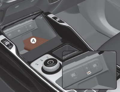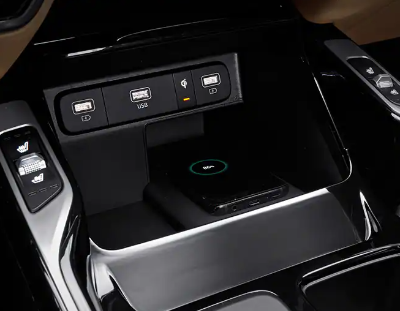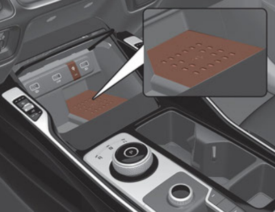 중앙 콘솔 앞쪽에 휴대폰 무선충전을 위한 시스템이 적용되어 있다. 휴대폰을 충전하기 위해서는 차량의 도어를 모두 닫고 시동 ON 상태에서 무선 충전이 지원되는 휴대폰을 충전 패드 위에 올려놓으면 충전이 시작된다.