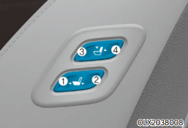 동승석 전·후 위치 : 버튼(1)을 누르면 시트가 앞으로 이동하고 버튼(2) 을 누르면 뒤로 이동한다. 동승석 각도 조절 : 버튼(3)을 누르면 등받이가 앞으로 접히고 버튼(4)을 누르면 뒤로 펼쳐진다.