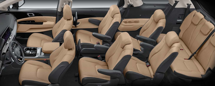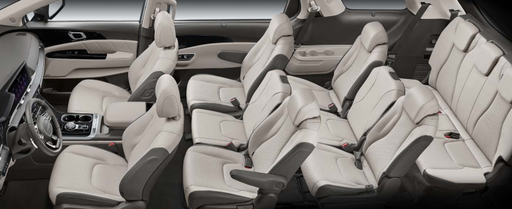 카니발 프레스티지 트림 시트는 인조 가죽 시트, 1열 열선시트, 1열 통풍시트, 운전석 전동식 허리지지대, 2열 열선시트, 2열 독립시트(전/후 슬라이딩, 리클라이닝, 워크인), 3열 독립시트(쿠션 팁업&전/후 슬라이딩, 리클라이닝), 4열 팝업 싱킹 시트가 기본 적용된다.