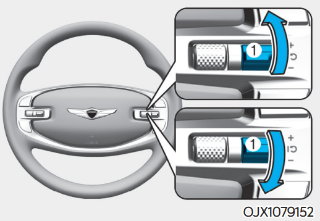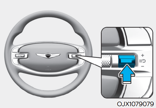 + 스위치 ①을 위로 올리거나 - 스위치 ①를 아래로 내려 원하는 속도를 설정한다. + 스위치 ①을 위로 길게 올리거나 - 스위치 ①를 아래로 길게 내리고 있으면 10km/h씩 속도가 증가하거나 감소한다.