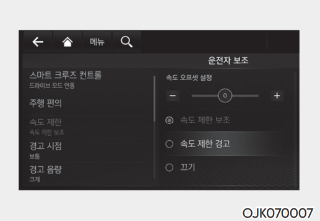 시동 ON 상태에서 설정 메뉴의 운전자 보조 → 속도 제한에서 세부 설정을 통해 각 기능의 사용 여부를 선택할 수 있다.