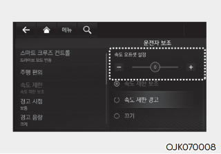 시동 ON 상태에서 설정 메뉴의 운전자 보조 → 속도 제한 → 속도 오프셋 설정을 선택하면 지능형 속도 제한 보조의 제한속도 오프셋을 변경할 수 있다. 인식된 제한속도에 속도 오프셋 설정 값을 반영하여 속도 제한 경고 및 보조가 작동한다.