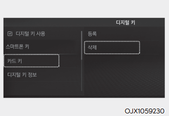 스마트 키를 이용하여 차량 전원을 ON 상태로 한 후 스마트 키를 차량 실내에 둔다. 인포테인먼트 시스템의 설정 → 차량 → 디지털 키 → 카드 키 → 삭제를 선택한 후 카드 키를 삭제한다. 등록된 디지털 카드 키가 없으면 삭제 메뉴가 비활성 상태 된다.