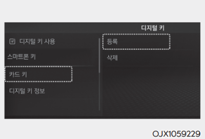 ① 시동 ON 상태에서 인포테인먼트 시스템의 설정 → 차량 → 디지털 키 → 카드 키 → 등록을 선택하여 카드 키를 등록한다.