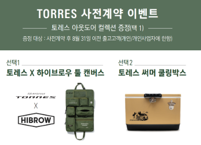 쌍용 자동차에서 중형 SUV 토레스 사전예약을 시작했습니다. 토레스는 투싼, 스포티지보다 저렴한 가격으로 T5는 2,740만 원, T7은 3,020만 원에 구입 가능합니다. 사전 예약 후 8월 31일 이전 출고 고객에게는 하이브로우 툴 캔버스 또는 써머 쿨링 박스를 증정합니다.