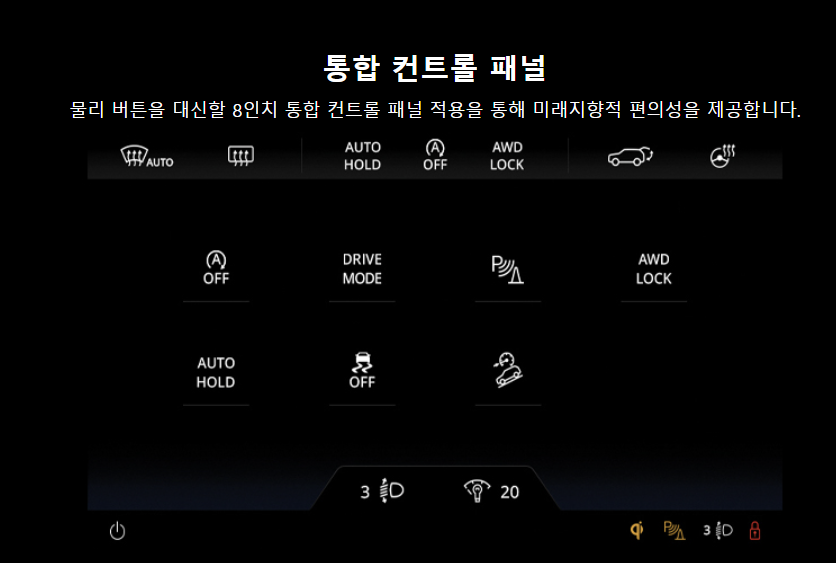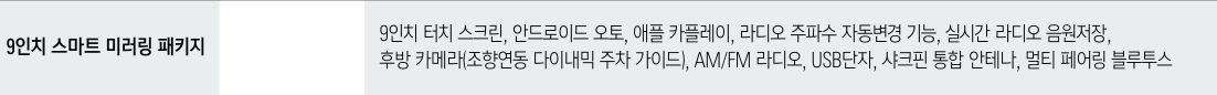 | 추가 기능 | - | SUS 도어 스커프(1열) 3D 매쉬매트 인텔리전트 어댑티브 크루즈 컨트롤 |