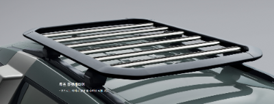 루프 플랫캐리어는 80만 원으로 차량 위쪽에 설치됩니다. 레저 활동을 위한 캠핑 용품, 루프탑 텐트 등 다양한 물건을 올릴 수 있으며, 오프로드 차량의 이미지를 제공합니다.