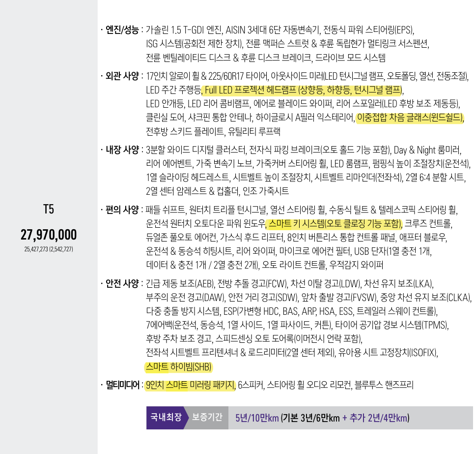 밸류업 패키지는 운전자의 편의 향상은 물론 외적인 디자인에도 큰 도움이 되기 때문에 T5 선택 시 밸류업 패키지 옵션을 추가하는 것도 고려해 보는 것이 좋습니다.