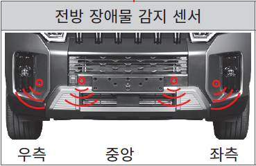 전방 주차 보조 경고 기능은 전방 장애물 감지 센서를 통해 장애물을 감지하는 기능으로 전자식 변속 레버를 D(주행) 또는 R(후진) 위치에 놓고 주행 시 범퍼에 장착되어 있는 장애물 감지 센서(초음파 센서)를 통해 장애물을 감지하여 경고음을 발생시켜 운전자에게 알려주는 주차 보조 경고(PAS) 기능입니다.