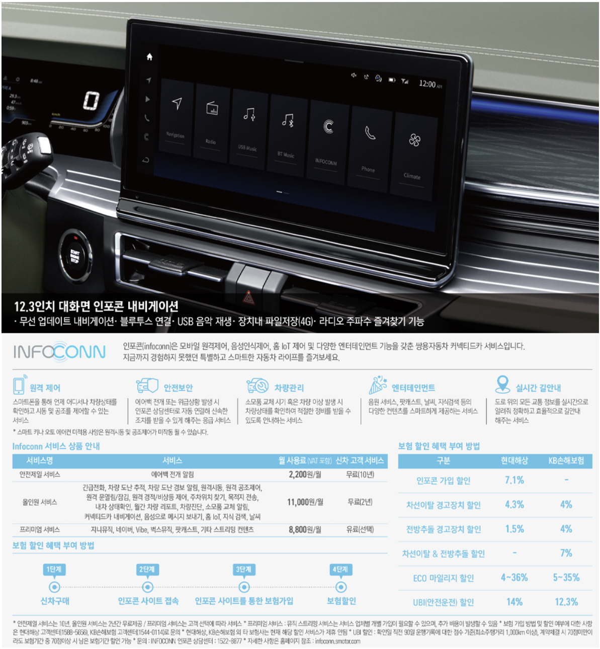 2024 토레스 T7는 12.3인치 인포콘 내비게이션 패키지가 추가 적용됩니다. 인포콘 내비게이션은 모바일 원격제어, 음성인식 제어, 홈 loT 제어 및 다양한 엔터테인먼트 기능을 갖춘 커넥티드 카 서비스입니다.