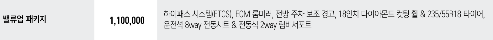밸류업 패키지에 포함되는 편의 기능을 보면 하이패스 시스템, ECM 룸미러, 운전석 8way 전동시트 & 전동식 2way 럼버서포트 기능은 운전자의 편의 향상에 큰 도움이 되는 기능입니다. 또한 전방 주차 보조 경고 기능은 주차 시 전방 장애물과의 충돌 위험이 있을 경우 운전자에게 경고하여 안전사고를 예방합니다.