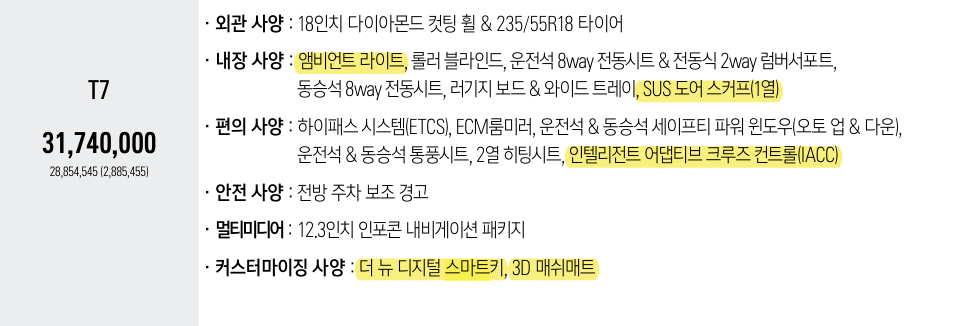 2024 T7은 앰비언트 무드램프, SUS 도어 스커프(1열), 인텔리전트 어댑티드 크루즈 컨트롤, 더 뉴 디지털 스마트키, 3D 매쉬 매트가 기본적용되며 가격이 97만 원 인상되었습니다.