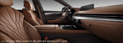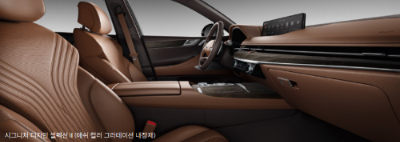 시그니처 디자인 셀렉션 1은 우아한 라인의 퀼팅과 파이핑이 적용되어 고급스러움이 느껴진다. G-Matrix 패턴 알루미늄 내장재가 크래쉬 패드와 도어 안쪽 잠금장치를 덮고 있는 부분에 적용된다. 또한, 인조 가죽 내장재가 크래쉬 패드, 도어 센터 트림에 적용되어 우레탄 재질보다 고급스럽다.