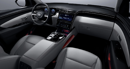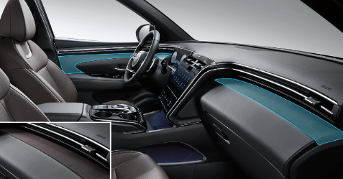 투싼 인스퍼레이션 트림은 클러스터(10.25'' 컬러 LCD, 오픈형), 앰비언트 무드램프(64컬러), 패브릭 감싸기(크래쉬패드/도어 센터), 블랙 하이그로시 도어 암레스트 몰딩, 메탈 페달, 메탈 도어스커프가 적용된다.