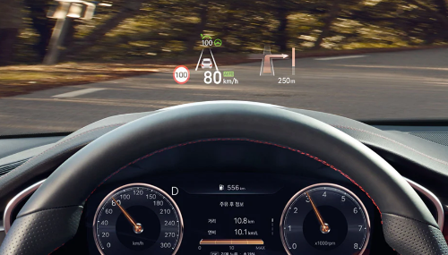 헤드업 디스플레이는 안전하고 편리한 주행을 위해 필수 정보를 운전자의 눈높이에 맞춰 표시한다. 스마트 크루즈 컨트롤, 과속단속 카메라 감지, 차로 이탈방지 보조 등을 헤드업 디스플레이에 적용하여 주행 편의성을 향상한다.