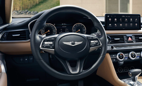 제네시스 G70 전동식 조절 스티어링 휠은 스티어링 휠의 높이를 신체에 알맞게 조절하기 위한 장치로 좌측 하단에 위치한 스위치를 통해 상하 또는 앞뒤로 움직여 위치를 조절할 수 있다.