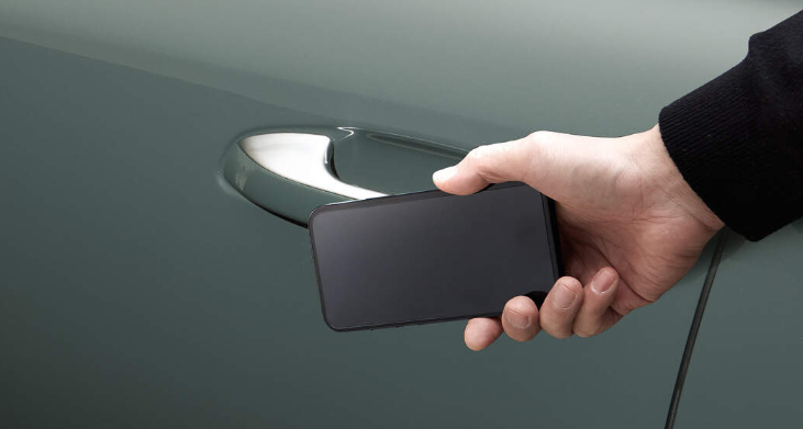 스마트폰에 적용된 NFC 기능을 활용하여 도어를 열고 닫을 수 있으며, 시동을 걸 수 있습니다. 스마트폰을 도어핸들에 가져다 대면 도어를 잠그거나 잠금을 해제할 수 있습니다. 또한 스마트폰을 실내 인증 패드 (무선 충전 패드)에 올려놓은 상태에서 브레이크를 밟고 시동 버튼을 누르면 차량의 시동이 걸립니다.