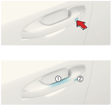 위 사진에 위쪽은 버튼 타입으로 화살표의 버튼을 눌러 도어를 잠그거나 해제할 수 있습니다. 아래쪽은 터치 타입으로 ①에 손을 가져다 대면 도어의 잠금이 해제되며 ②에 손을 대면 도어가 잠깁니다.