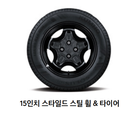 15인치 스타일드 스틸 휠은 스마트, 스마트 초이스, 디 에센셜 라이트, 디 에센셜 트림에서 기본으로 적용되는 캐스퍼 15인치 전용 휠로 아이코닉한 캐스퍼의 매력을 더욱 돋보이게 만들어준다.