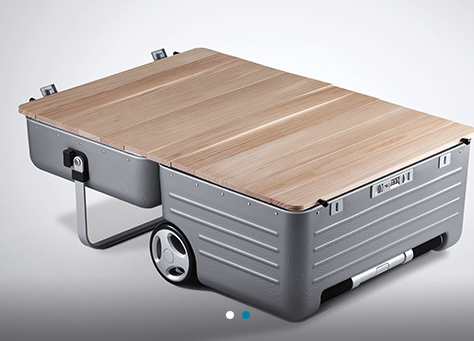 트립웨어 브랜드 로우로우와 협업한 다목적 캠핑 트렁크이다. 캐리어 및 테이블로 활용이 가능하며, 사이즈 60L, 무게 5.25kg (우드 플레이트: 2.2kg)이다.