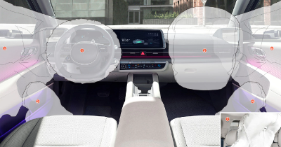* 7 에어백 : 운전석/동승석, 전석 사이드 및 커튼 에어백 등의 에어백을 탑재하여 전방위 충돌로부터 승객을 안전하게 보호한다. (1. 운전석 어드밴스드 에어백 / 2. 동승석 어드밴스드 에어백 / 3,4. 앞좌석 사이드 에어백 / 5. 센터 사이드 / 6,7. 커튼 에어백)