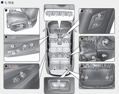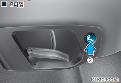 * 2열 시트 : 2열 좌석 등받이 상단의 스위치 또는 2열 좌석 바깥쪽 스위치를 누르면 등받이가 접히면서 좌석이 앞으로 살짝 이동한다.