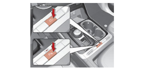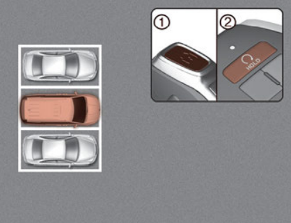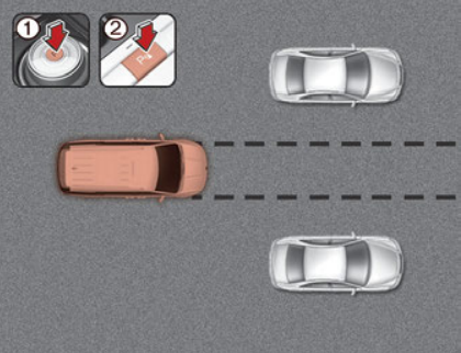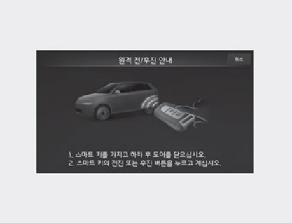 원격 전/후진 기능을 사용하려는 공간 앞에 차량을 세우고 주차단①으로 변속한다. 실내 주차/뷰 버튼②을 길게 누르면 원격 스마트 주차 보조가 켜지고 인포테인먼트 시스템 화면에 안내문이 표시된다. 이때 스마트키를 휴대하고 차에서 내린 후 모든 도어 및 테일게이트를 닫는다.