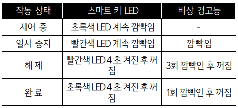 스마트 키의 LED 색을 통해 원격 스마트 주차 보조 기능이 정상 작동하고 있는지 확인할 수 있다. 원격 스마트 주차 보조 기능이 작동 중일 때는 초록색 LED가 계속 깜빡인다. 일시 중지될 경우 빨간색 LED가 계속 깜박인다.