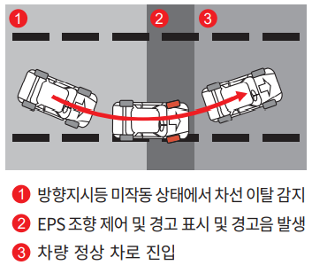 차로 이탈 경고 기능은 차량이 차선을 이탈할 경우 경고만 해주는 기능이라면 차선 유지 보조 기능은 방향지시등 미작동 상태로 차선을 이탈할 경우, 스티어링 휠 제어를 통해 차선을 유지하도록 돕는 주행 보조 장치이다.