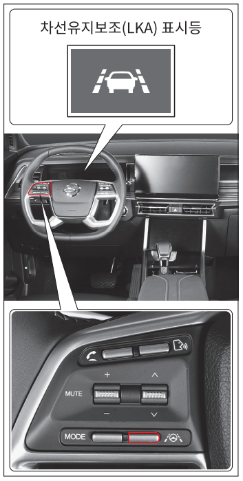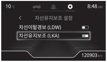 계기판 사용자 설정에서 주행 보조 설정 → 전방 안전 보조 → 차선 유지 보조 설정 → 차선 유지 보조(LKA) 표시를 체크하면 차선 유지 보조 기능이 설정된다.