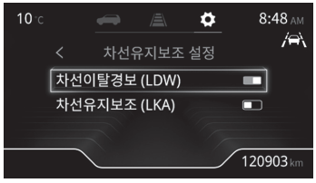 계기판 사용자 설정에서 주행 보조 설정 → 전방 안전 보조 → 차선 유지 보조 설정 → 차선 이탈 경고(LDW) 표시를 체크하면 차선 이탈 경고 기능이 설정된다.